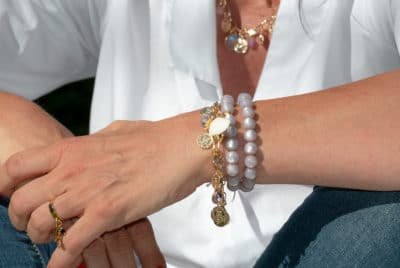 Bracelet double perle couleur parme - pendentifs coquillage, swarovski serti dans un écrin doré et soleil doré - Photo avec le ...36,00€