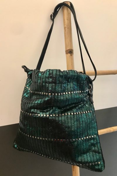 Sac vert brillant lanières ajustables courtes ou longues décoration petits clous argentés Largeur 40cm et Hauteur 35cmLe prix initial était : 40,00€.20,00€Le prix actuel est : 20,00€.