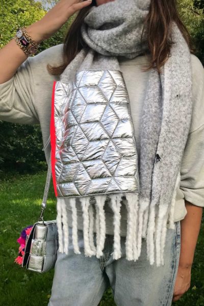 Écharpe grise et blanche personnalisée avec un tissus argenté matelassé et une fine ligne orange agréable au touché par ...Le prix initial était : 50,00€.25,00€Le prix actuel est : 25,00€.