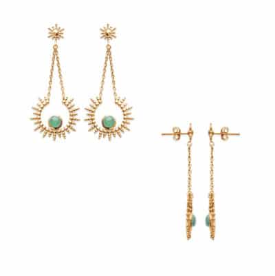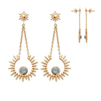 - Boucles d'oreilles plaquées or 18 carats en forme de soleil qui a pour centre la magnifique pierre semi-précieuse labradorite