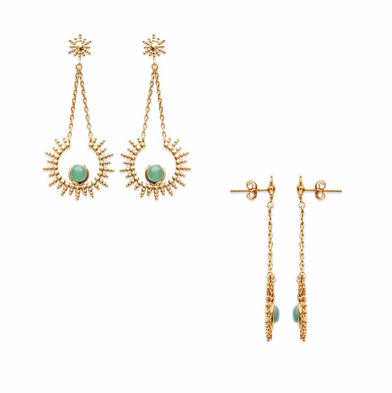 Boucles d’oreilles plaquées or 18 carats en forme de soleil qui a pour centre la magnifique pierre semi-précieuse en aventurine