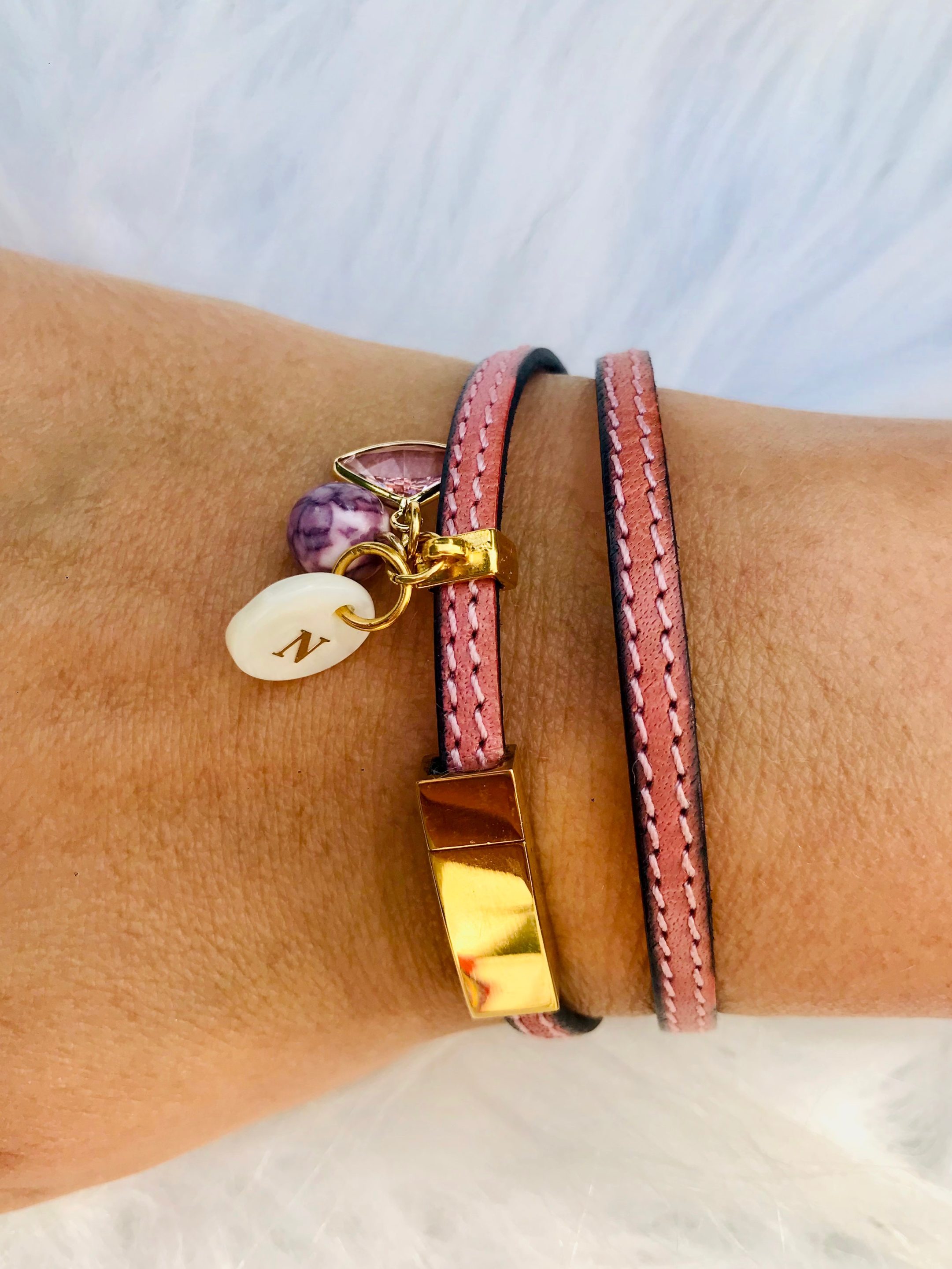 Bracelet en cuire avec attache aimantée dorée et pendentif perle et quartz rose